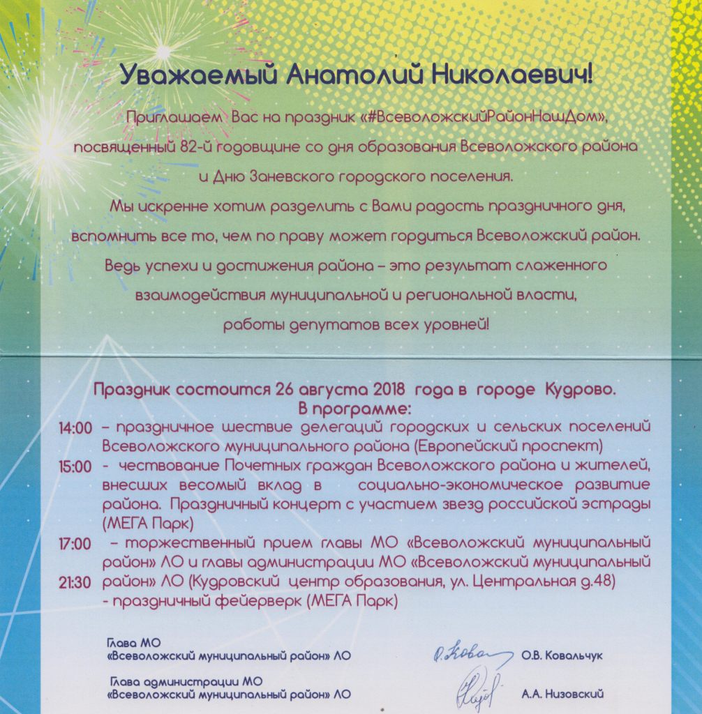 26 августа 2018 года состоялось празднование Всеволожского района - 82 года. Анатолий Николаевич Асаул приглашен администрацией в качестве почетного гостя.