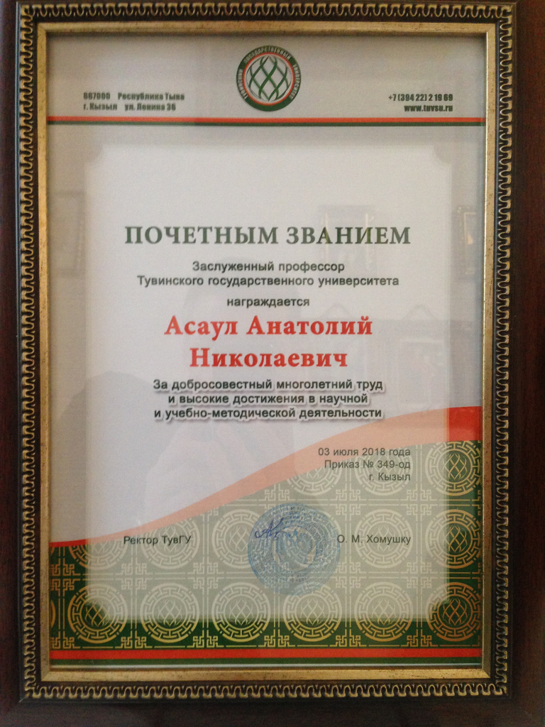 3 июля 2018 г. профессора А.Н.Асаула наградили почётным званием: Заслуженный профессор Тувинского государственного университета (ТувГУ)