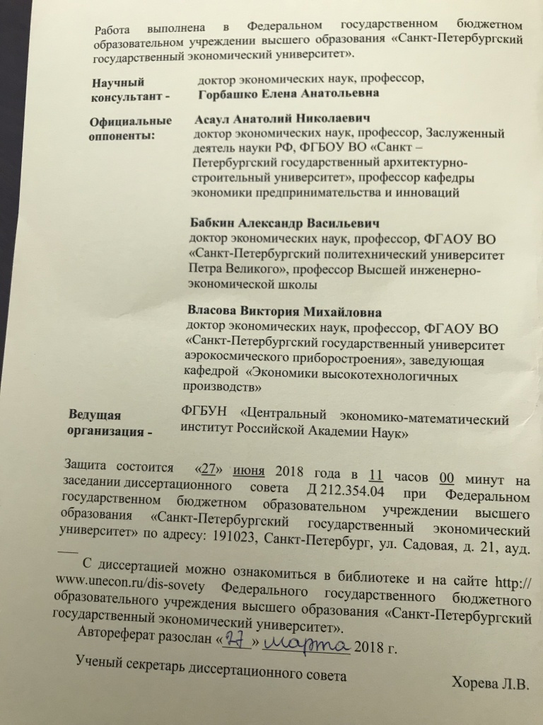 27.06.2018 в диссертационном совете Д 212.354.04 при Федеральном государственном бюджетном образовательном учреждении высшего образования "Санкт-Петербургский государственный экономический университет" прошла успешная защита Азиминой Екатерины Валерьевны.