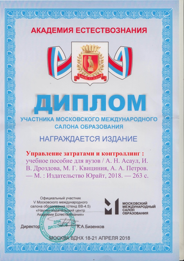 - Асаул А.Н., Дроздова И.В., Квициния М.Г., Петров А.А. Управление затратами и контроллинг