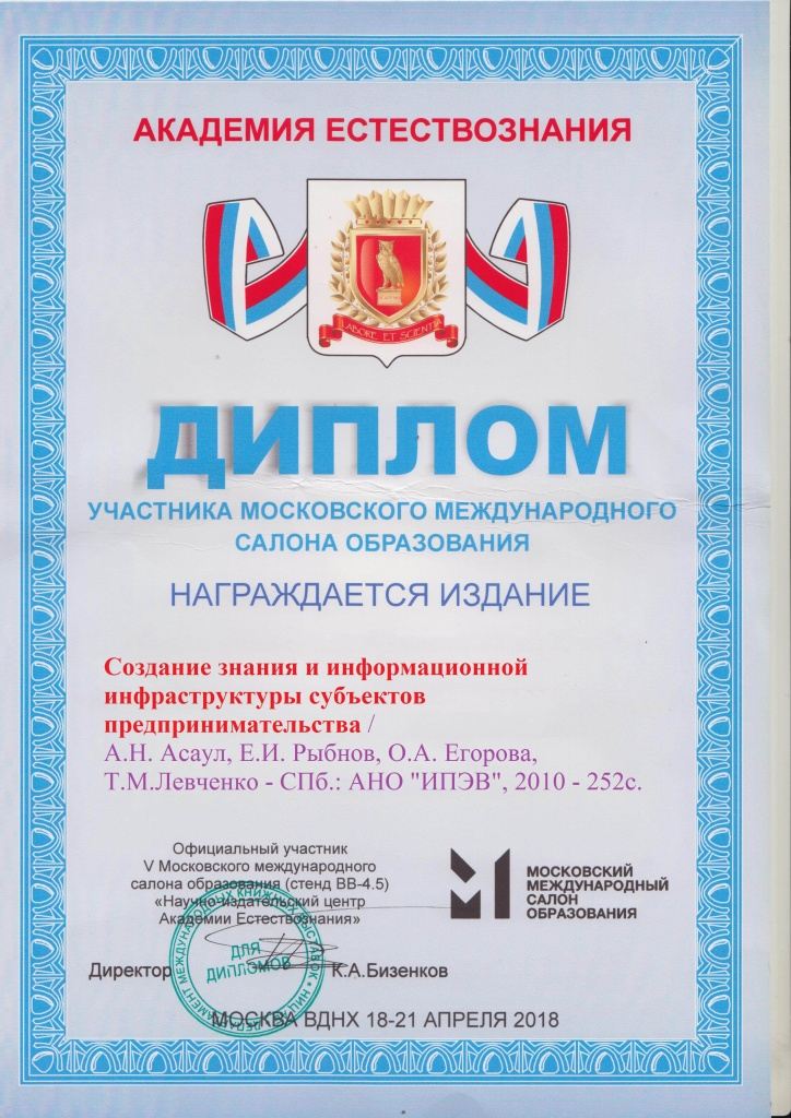- Асаул А.Н., Рыбнов Е.И., Егорова О.А., Левченко Т.М.; под ред. Асаула А.Н. Создание знания и информационной инфраструктуры субъектов предпринимательства