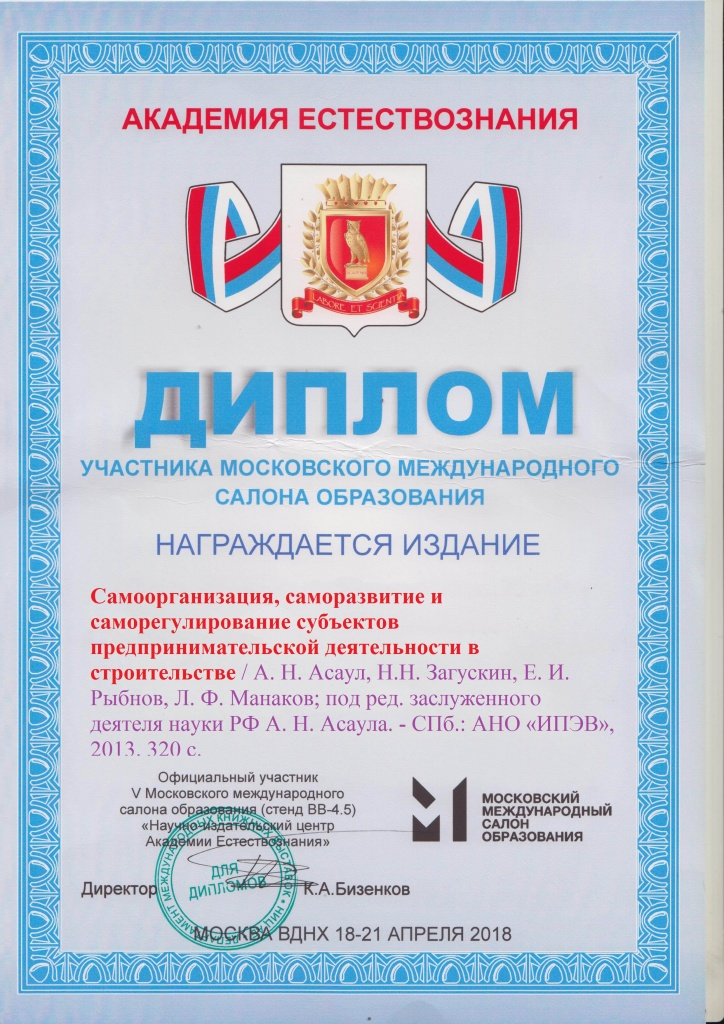 - Асаул А.Н., Загускин Н.Н., Манаков Л.Ф., Рыбнов Е.И.; под ред. Асаула А.Н. Самоорганизация, саморазвитие и саморегулирование субъектов предпринимательской деятельности в строительстве