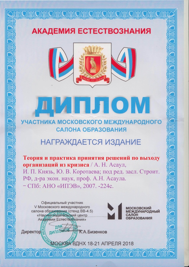 - Асаул А.Н., Князь И.П., Коротаева Ю.В.; под ред. Асаула А.Н. Теория и практика принятия решений по выходу организаций из кризиса