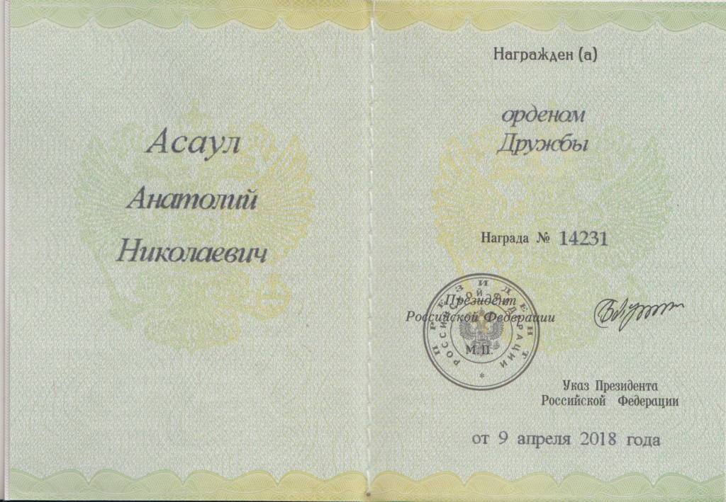 24 апреля в Смольном состоялось торжественное вручение А.Н.Асаулу государственной награды за заслуги в научно-педагогической деятельности, подготовке квалифицированных специалистов и многолетнюю добросовестную работу орденом Дружбы. Губернатор Санкт-Петербурга Георгий Полтавченко по поручению Президента России вручил награду и поблагодарил Анатолия Николаевича за умение по-настоящему работать, желание приносить пользу нашему городу и стране.