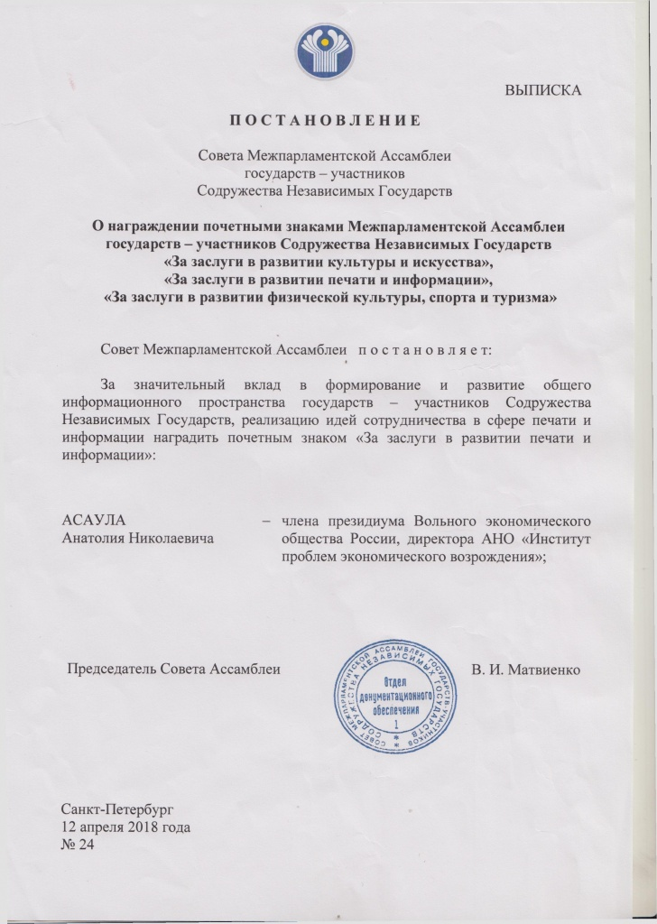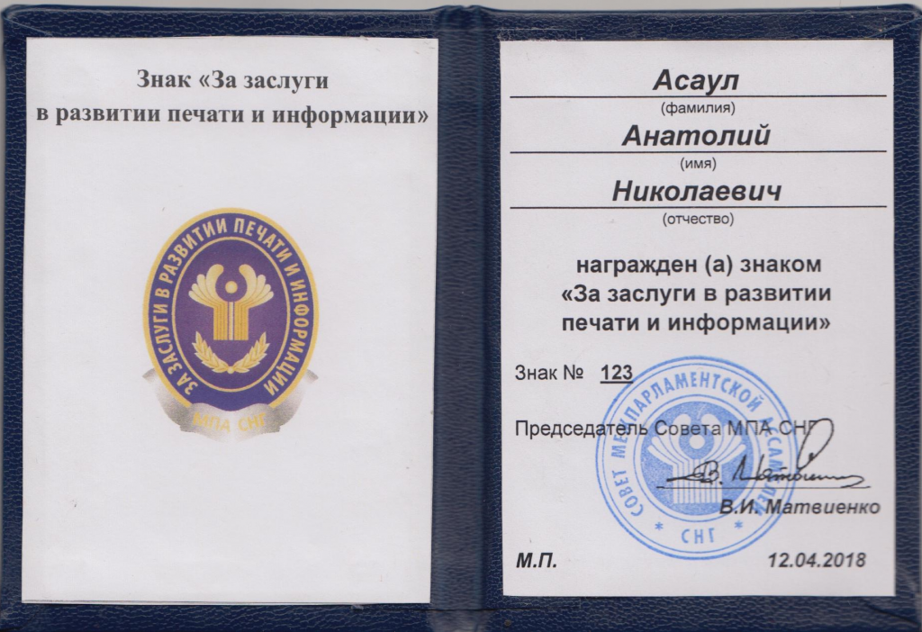 21 апреля 2018 года во дворце Державина начальник отдела Секретариата Совета Межпарламентской Ассамблеи СНГ К.А.Пшенко вручил от В.И.Матвиенко профессору Анатолию Николаевичу Асаулу почетный знак "За заслуги в развитии печати и информации".