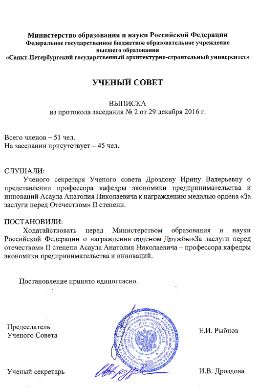 о научно-педагогической деятельности, доктора экономических наук, профессора, заслуженного деятеля науки РФ Асаула Анатолия Николаевича, профессора кафедры экономики предпринимательства и инноваций ГБОУ ВО Санкт-Петербургского государственного архитектурно-строительного университета