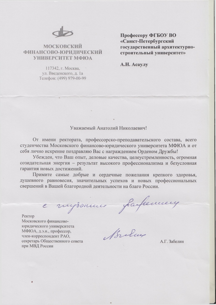 9 апреля 2018 года вышел Указ Президента Российской Федерации № 151 "о награждении орденом Дружбы" заслуженного деятеля науки РФ, заслуженного строителя РФ, доктора экономических наук, профессора Анатолия Николаевича Асаула.