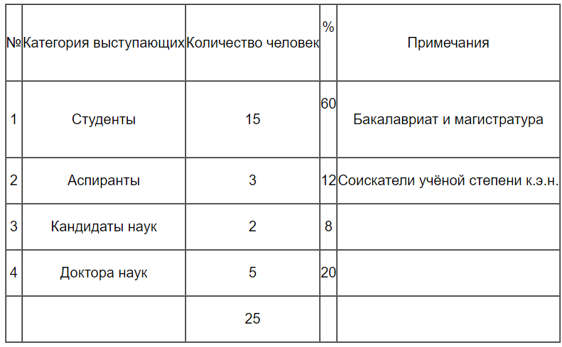 На научной секции с докладами (научными сообщениями) о результатах НИРС, выполненной на кафедре Экономики предпринимательства и инноваций выступили 15 студентов бакалавриата и магистратуры Санкт-Петербургского государственного архитектурно-строительного университета, а также три аспиранта и соискателя учёной степени кандидата экономических наук (см. табл.).