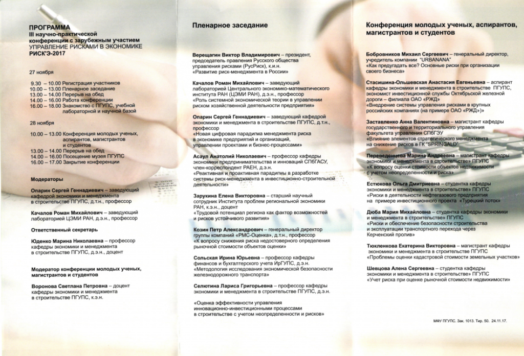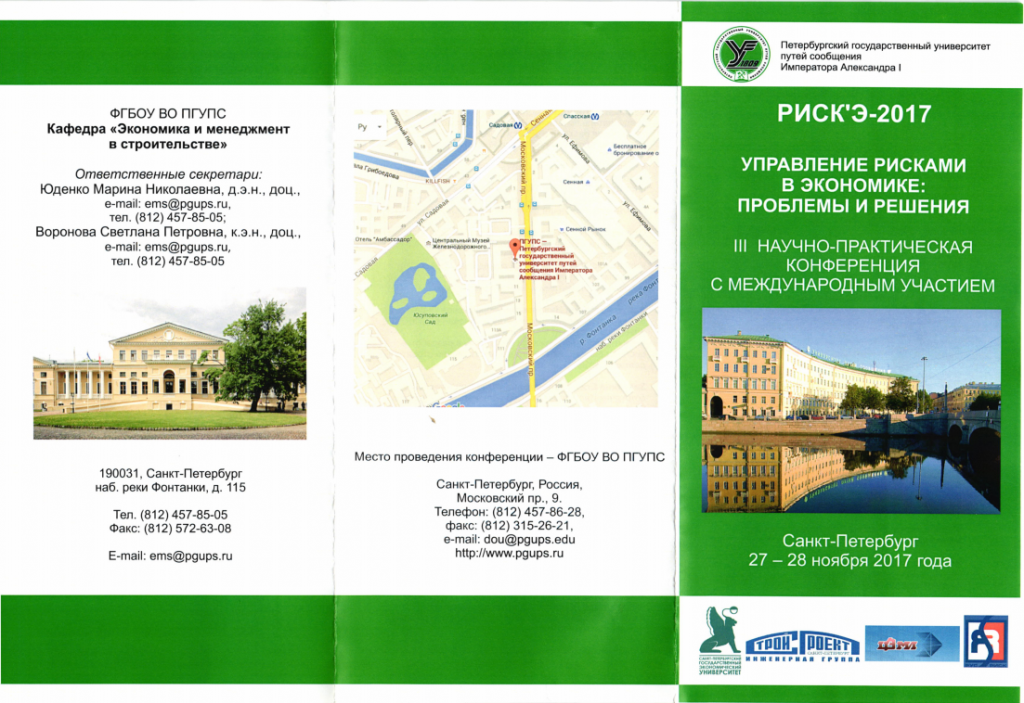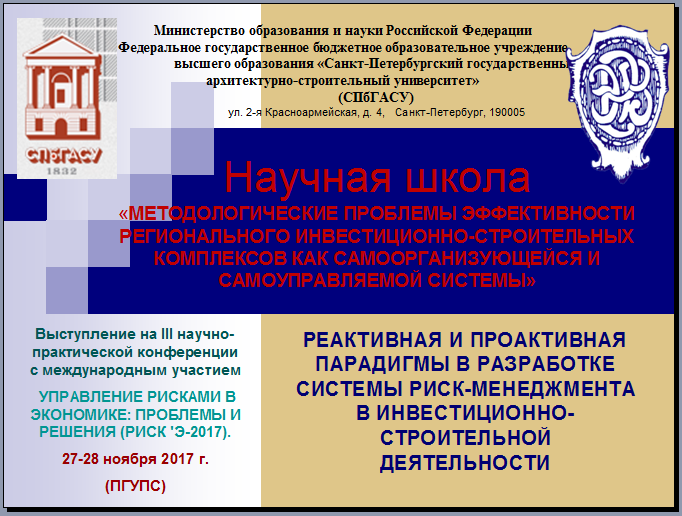 Тема доклада:"Реактивная и проактивная парадигмы в разработке системы риск-менеджмента в инвестиционно-строительной деятельности" в Петербургском государственном университете путей сообщения Императора Александра I про III Научно-практическая конференция с зарубежным участием «Управление рисками в экономике: проблемы и решения» (РИСК`Э-2017).