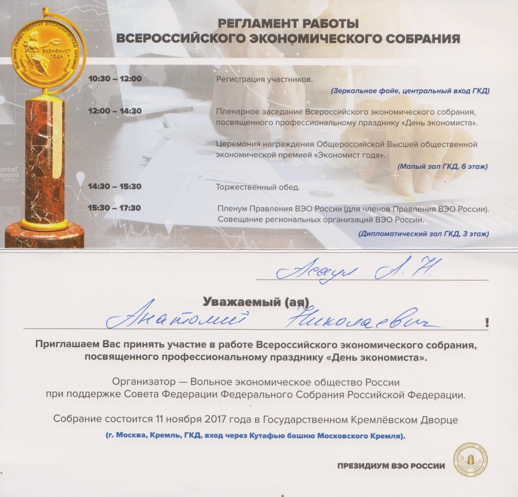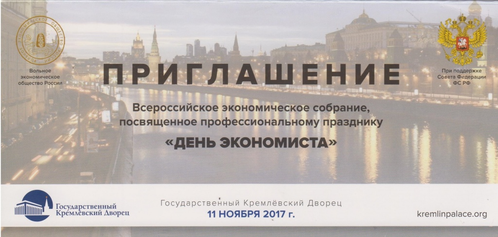 Всероссийское экономическое Собрание состоялось в Государственном Кремлёвском Дворце. Профессиональный праздник «День экономиста» учрежден решением Правительства России по инициативе Вольного экономического общества России.