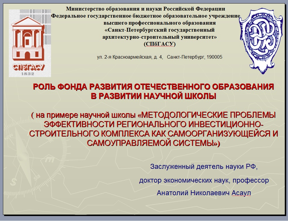 И выступил с докладом «Роль Фонда развития отечественного образования в развитии научной школы (на примере научной школы «Методологические проблемы эффективности региональных ИСК как самоорганизующейся и самоуправляемой системы» при СПбГАСУ).