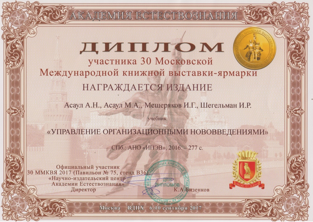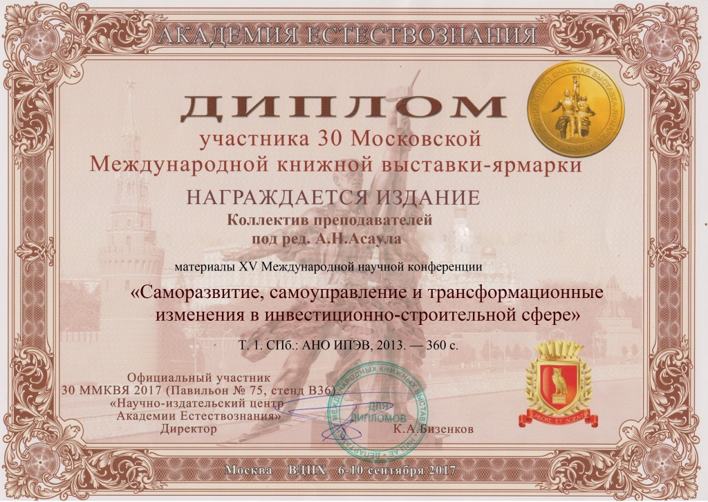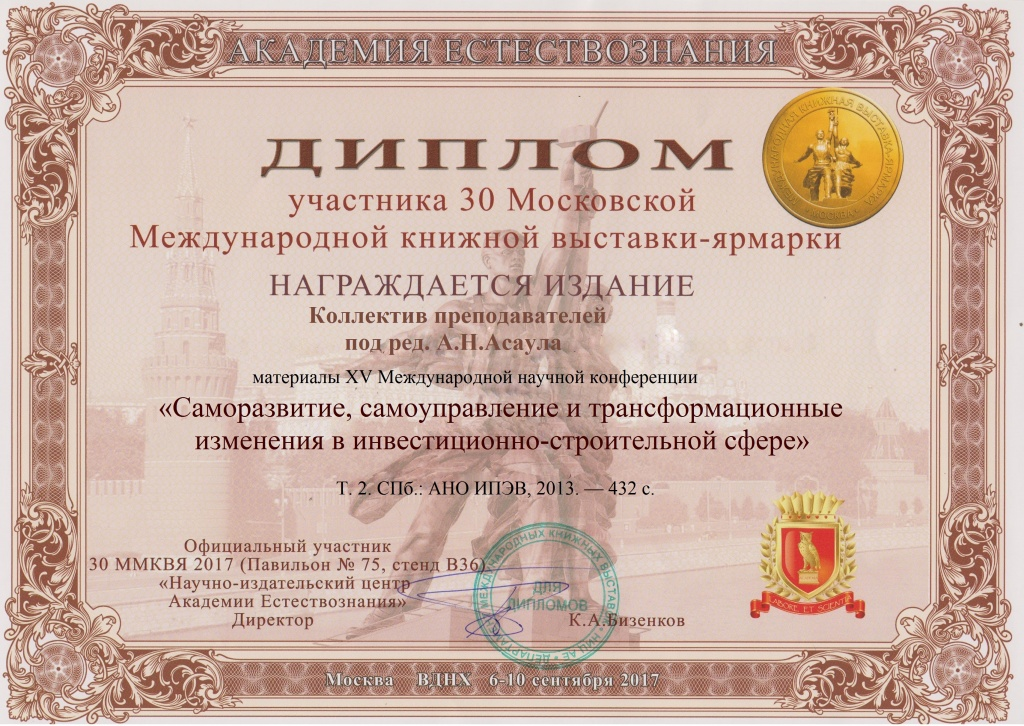 10 сентября 2017 года в павильоне № 75 ВДНХ завершила работу 30-я Московская международная книжная выставка-ярмарка - крупнейший в России книжный форум международного масштаба, который традиционно является одним из центральных событий года в литературной и книжной среде. Участниками старейшего книжного форума страны стали более 500 российских и зарубежных издательств из 29 стран, которые традиционно представили лучшие образцы учебной, научной, справочно-энциклопедической, художественной, детской литературы.Всего выставку-ярмарку за пять дней активной и насыщенной работы посетили 130 тысяч москвичей и гостей столицы. Представленные книги научной школы "Методологические проблемы эффективности региональных ИСК как самоорганизующейся и самоуправляемой системы" при Санкт-Петербургском государственном архитектурно-строительном университете награждены Дипломами участников 30 Московской Международной книжной выставки-ярмарки: