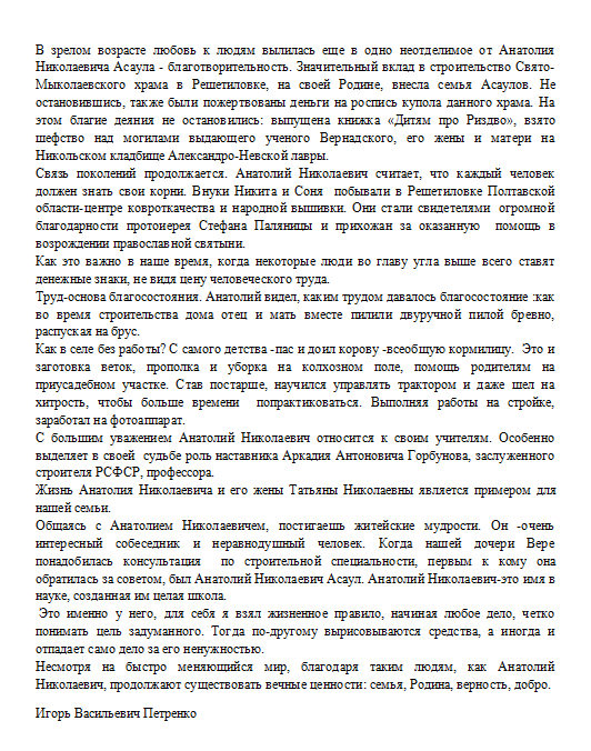 Выдержка из книги "Жизнь и судьба Анатолия Асаула: Кн.1. Малая родина / В.И. Фёдоров. - СПб.: АНО "ИПЭВ",2014. - 256 с.