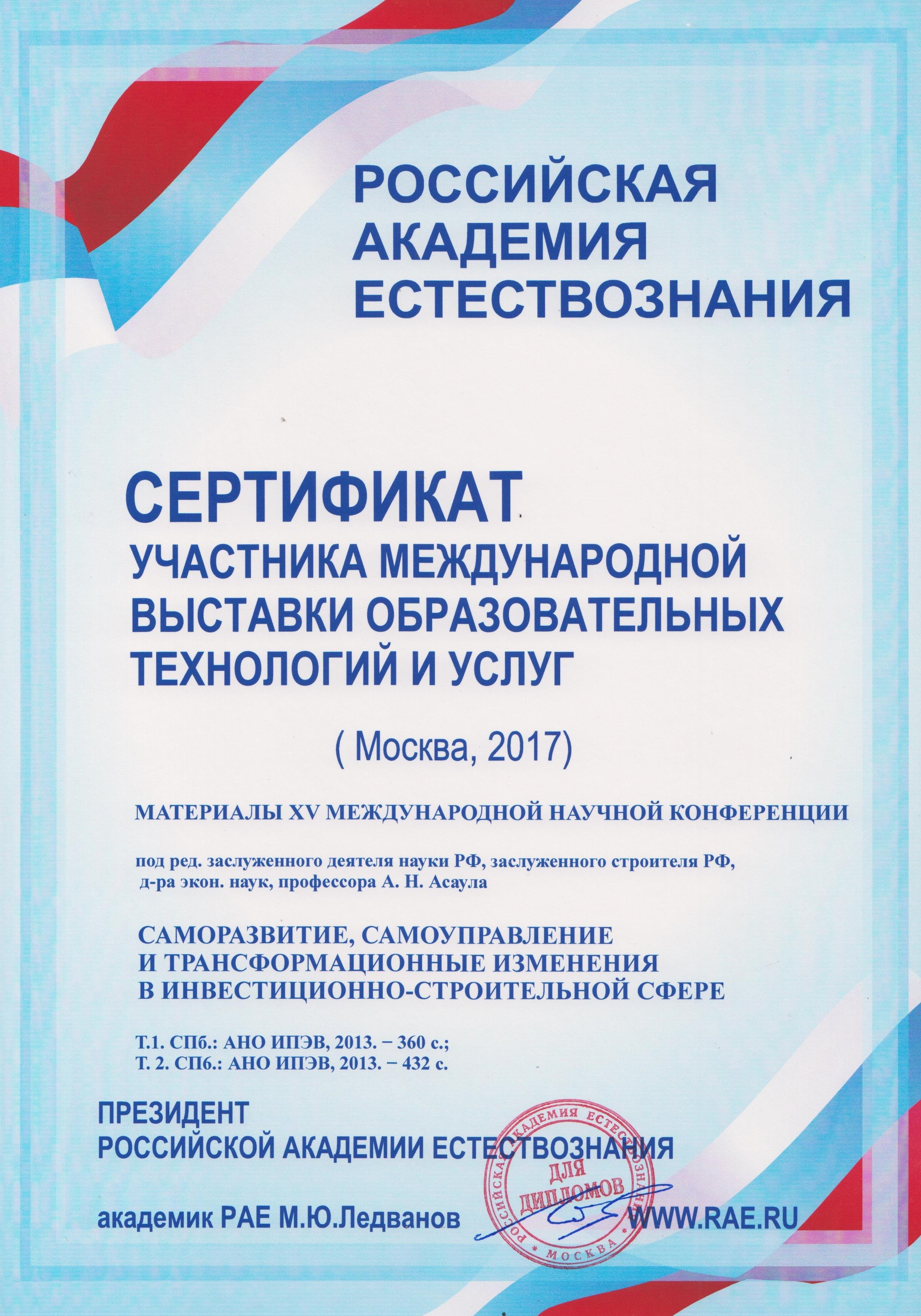 ‒ Саморазвитие, самоуправление и трансформационные изменения в инвестиционно-строительной сфере: материалы XV Международной научной конференции под ред. заслуженного деятеля науки РФ, заслуженного строителя РФ, д-ра экон. наук, профессора А. Н. Асаула. Т. 1. СПб.: АНО ИПЭВ, 2013. — 360 с.; Т. 2. СПб.: АНО ИПЭВ, 2013. — 432 с.