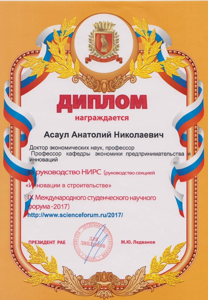 Профессор А.Н. Асаул − лучший руководитель секции IX Международной студенческой электронной научной конференции "Студенческий научный форум 2017"