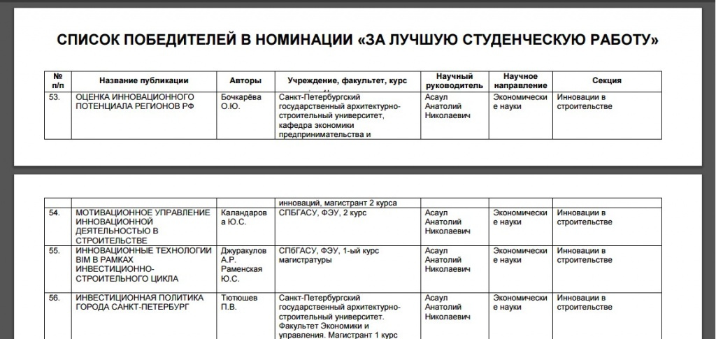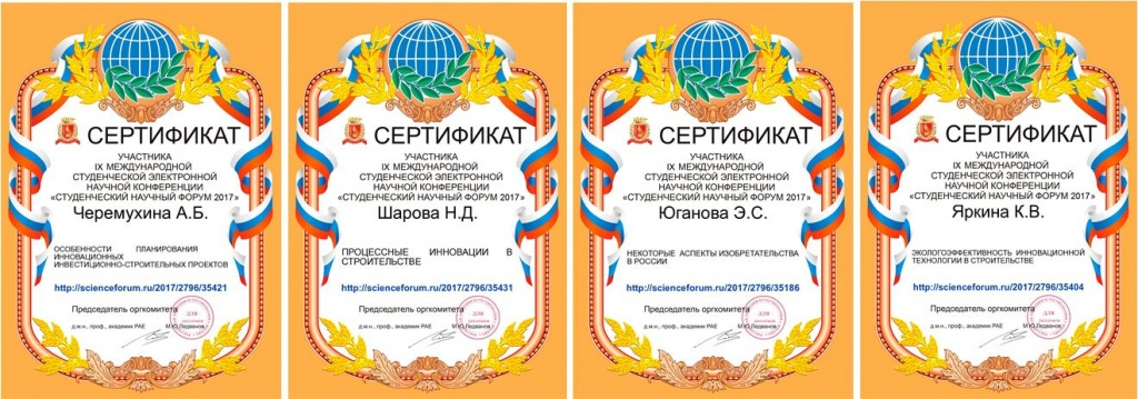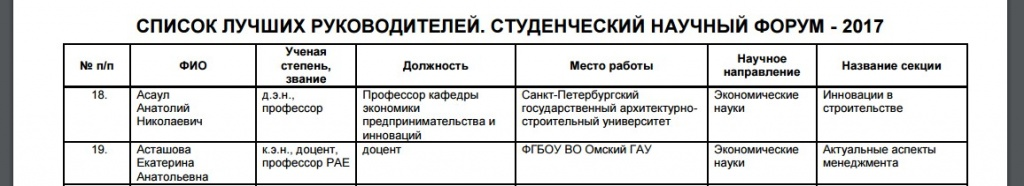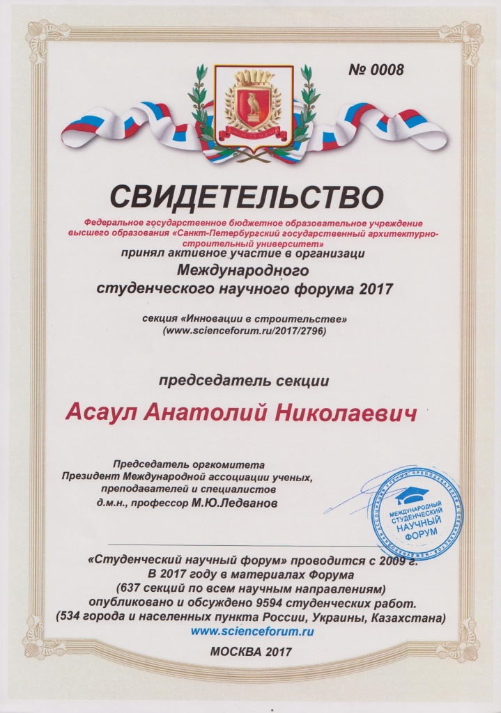 С 1 декабря по 10 апреля 2017г. работала IX Международная студенческая электронная научная конференция "Студенческий научный форум 2017", организованная Российской Академией Естествознания (Международная ассоциация ученых, преподавателей и специалистов). В работе Международного студенческого форума 2017 представлено 9536 докладов, 634 научные секции. Профессором Анатолием Николаевичем Асаулом организована секция «Инновации в строительстве», в которую вошли работы 20 магистрантов Санкт-Петербургского государственного архитектурно-строительного университета.