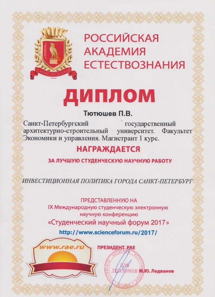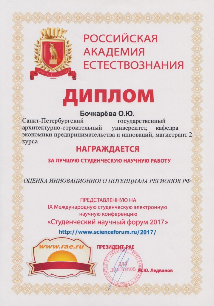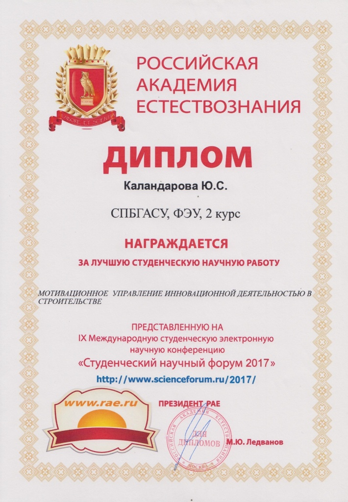 По решению Президиума РАЕ профессор признан лучшим руководителем секции форума и награждён дипломом РАЕ "За руководство научно-исследовательской работой студентов Международной электронной научной конференции "Студенческий научный форум 2017".