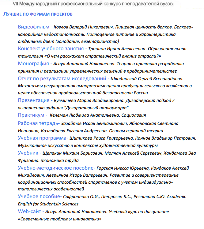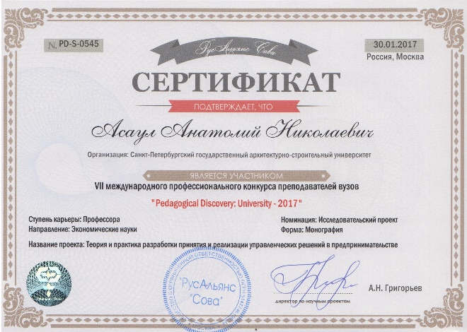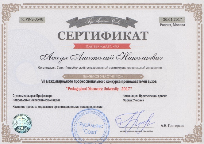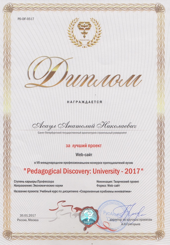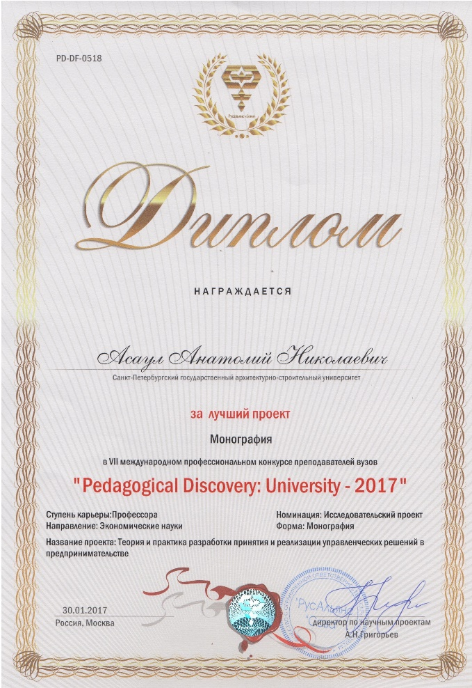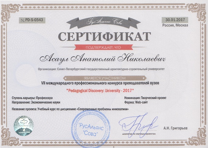 Заслуженный деятель науки РФ, д.э.н., профессор А.Н. Асаул принял участие в VII международном профессиональном конкурсе преподавателей вузов "Pedagogical Discovery: University - 2017" в 4 номинациях (практический проект, исследовательский проект, информационный проект, творческий проект) и удостоен звания «Лучший по формам проектов» в 2 номинациях (исследовательский проект, творческий проект).