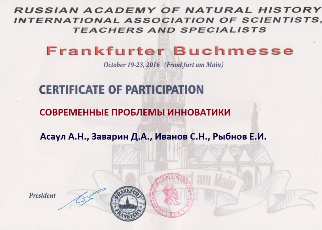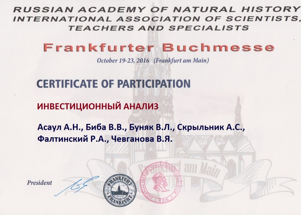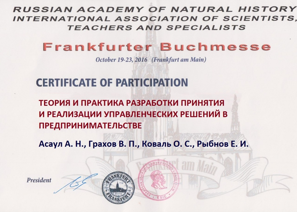 Вышеназванные книги пополнили серию книг «Экономическое возрождение России», издающейся при поддержке АНО «Институт проблем экономического возрождения». Автор идеи и руководитель проекта – заслуженный деятель науки РФ, доктор экономических наук, профессор А.Н. Асаул. Каждое из изданий удостоено диплома участника и золотой медалью Франкфуртской книжной выставки.