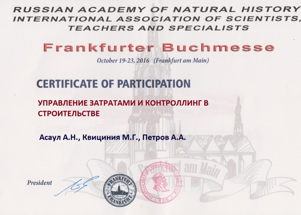 На стенде, сформированном Российской Академией Естествознания представлены книги членов научной школы «Методологические проблемы эффективности инвестиционно-строительных комплексов, как самоорганизующейся и самоуправляемой системы» (основатель и лидер, заслуженный деятель науки, доктор экономических наук, профессор А. Н. Асаул): 1. Асаул А.Н., Квициния М.Г., Петров А.А. Управление затратами и контроллинг в строительстве 2. Асаул А. Н., Грахов В. П., Коваль О. С., Рыбнов Е. И. Теория и практика разработки принятия и реализации управленческих решений в предпринимательстве 3. Асаул А.Н., Биба В.В., Буняк В.Л., Скрыльник А.С., Фалтинский Р.А., Чевганова В.Я. Инвестиционный анализ 4. Асаул А.Н., Заварин Д.А., Иванов С.Н., Рыбнов Е.И. Современные проблемы инноватики