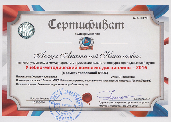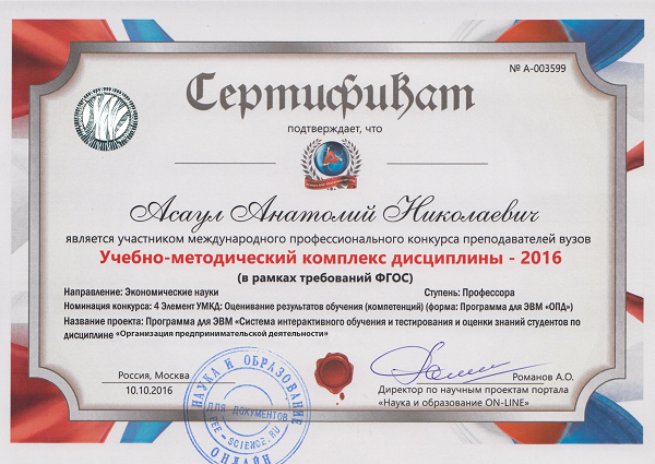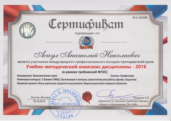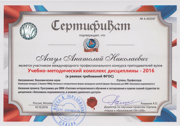 Профессор А.Н. Асаул занял 2 место в Международном профессиональном конкурсе преподавателей ВУЗов «Учебно-методический комплекс дисциплины – 2016» (в рамках требований ФГОС)