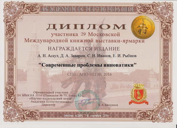 Асаул А.Н. Современные проблемы инноватики: учебное издание / А. Н. Асаул, Д. А. Заварин, С. Н. Иванов, Е. И. Рыбнов; под ред. заслуженного деятеля науки РФ, д-ра экон. наук, проф. А. Н. Асаула. - СПб.: АНО ИПЭВ, 2016. - 208с.