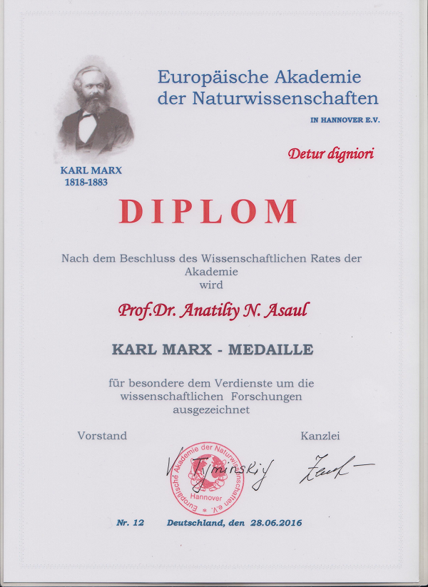 12 июня 2016г. Президиумом Академии Естественных Наук было принято решение об учреждении медали Карла Маркса. 28.июня 2016г. профессор А.Н. Асаул, действующий член Европейской Академии Естественных Наук, в числе первых был награждён медалью Карла Маркса «За особые заслуги в научных исследованиях».