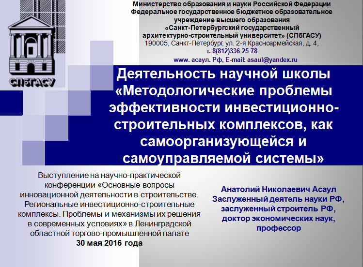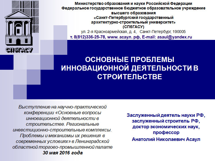 Участие профессора А.Н. Асаула в научно-практической конференции «Основные вопросы инновационной деятельности в строительстве. Региональные инвестиционно-строительные комплексы. Проблемы и механизмы их решения в современных условиях».