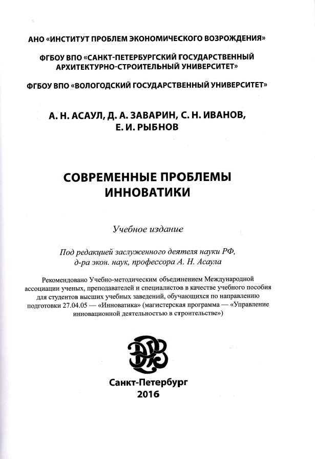 В издательстве АНО «Институт проблем экономического возрождения» в серии книг «Экономическое возрождение России» вышел из печати очередной 55 том: Современные проблемы инноватики: учебное издание / А.Н. Асаул, Д.А. Заварин, С.Н. Иванов, Е.И. Рыбнов; под ред. заслуженного деятеля науки РФ, д-ра экон. наук, проф. А.Н. Асаула. — СПб.: АНО ИПЭВ, 2016. 208с.
