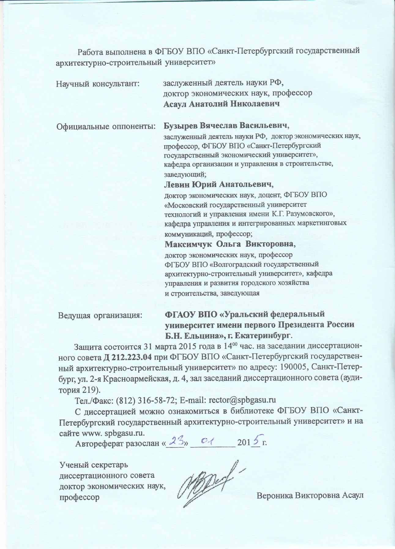 В диссертационном совете Санкт-Петербургского государственного архитектурно-строительного университета успешно прошла защита докторской диссертации Вячеслава Кыргысовича Севека на тему «Формирование организационно-экономического механизма развития жилищного строительства в регионах». Работа выполнена в соответствии с основными направлениями деятельности научной школы "Методологические проблемы эффективности региональных инвестиционно-строительных комплексов как самоорганизующейся и саморегулируемой системы" при Санкт-Петербургском архитектурно-строительном университете (основатель и лидер школы заслуженный деятель науки, д.э.н., профессор А.Н.Асаул).