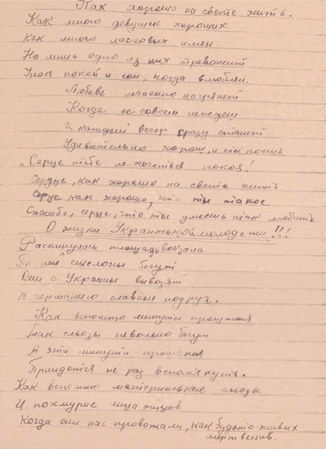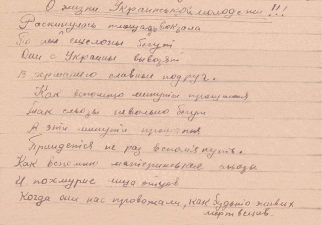 Раскинулась площадь вокзала, По ней эшелоны бегут. Они с Украины вывозят В Германию славных подруг… … Украина моя, Украина! Весёлая жизнь в ней была. Сейчас же на смерть на лютую Германия всех забрала. Прощай, дорогой городишко, Прощай, дорогая семья, Прощай, черноглазый мальчишка! Прошу вспоминать про меня. Прощайте зелёные парки Мне больше по ним не гулять Я еду в суровую Германию Свой век молодой доживать…