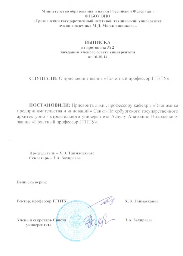 Заслуженному деятелю науки РФ, доктору экономических наук, профессору Асаулу А.Н. было присвоено звание «Почетный профессор ГГНТУ», г. Грозный. 16 октября 2014 г.