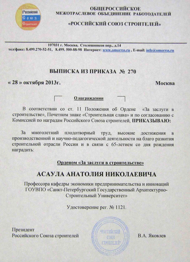 31 октября 2013 Анатолию Николаевичу вручили орден "За заслуги в строительстве"