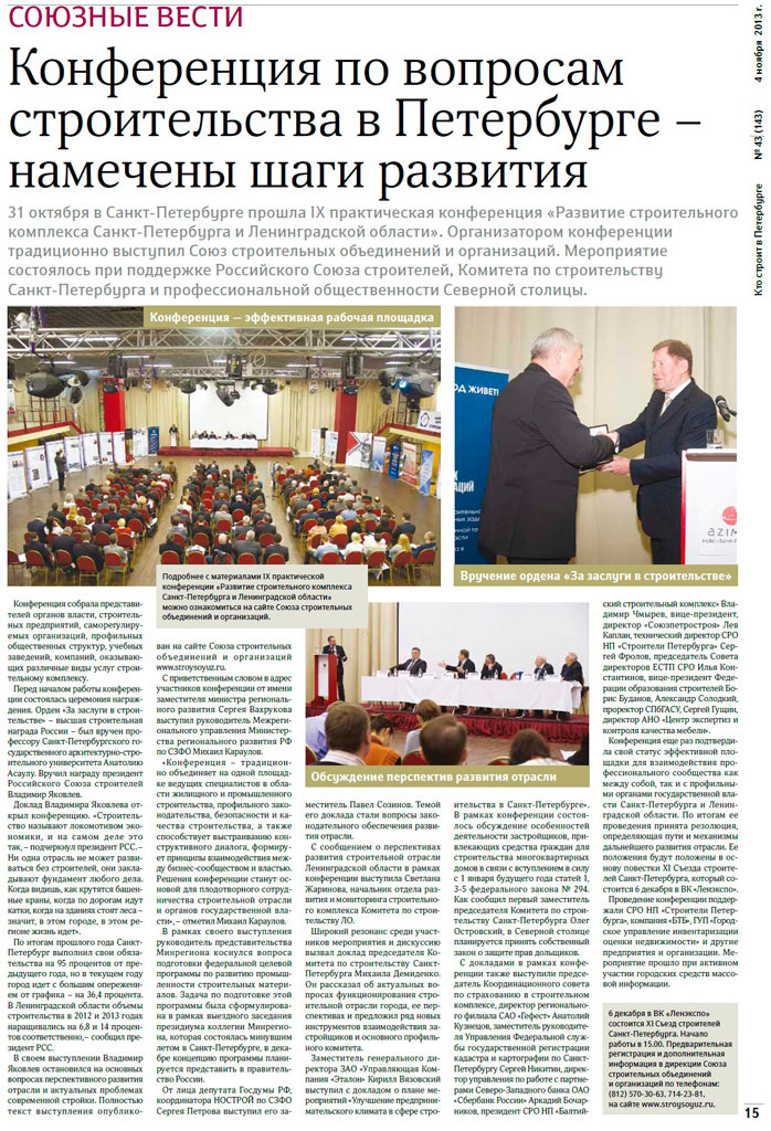 31 октября в Санкт-Петербурге прошла IX практическая конференция «Развитие строительного комплекса Санкт-Петербурга и Ленинградской области». Организатором конференции традиционно выступил Союз строительных объединений и организаций. Мероприятие состоялось при поддержке Российского Союза строителей, Комитета по строительству Санкт-Петербурга и профессиональной общественности Северной столицы.