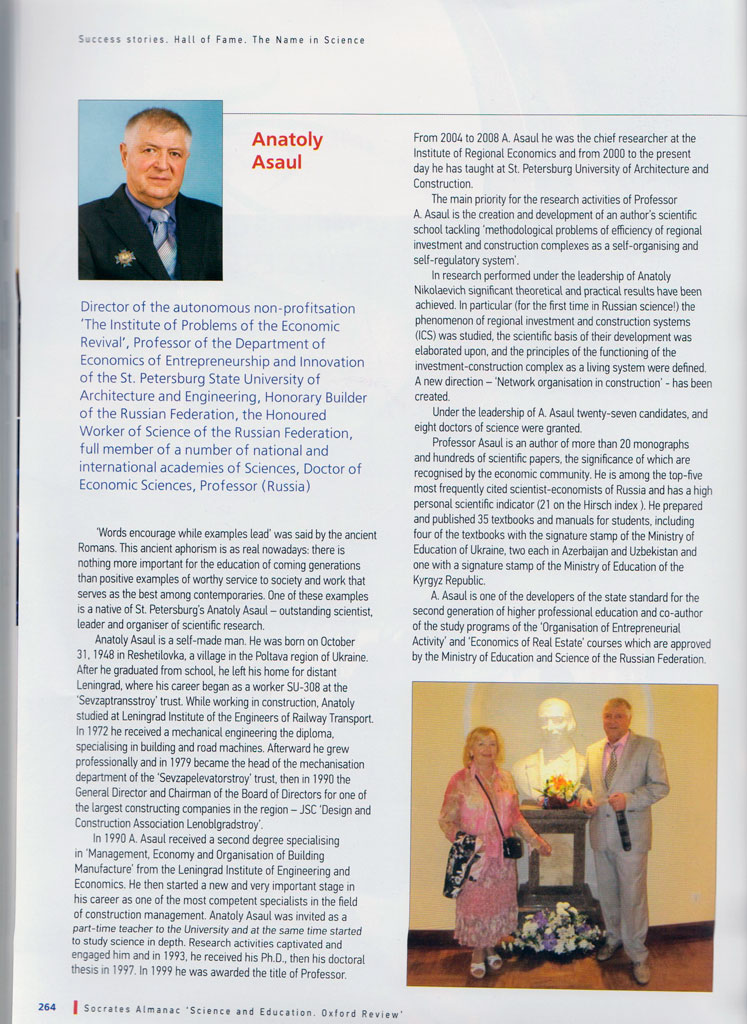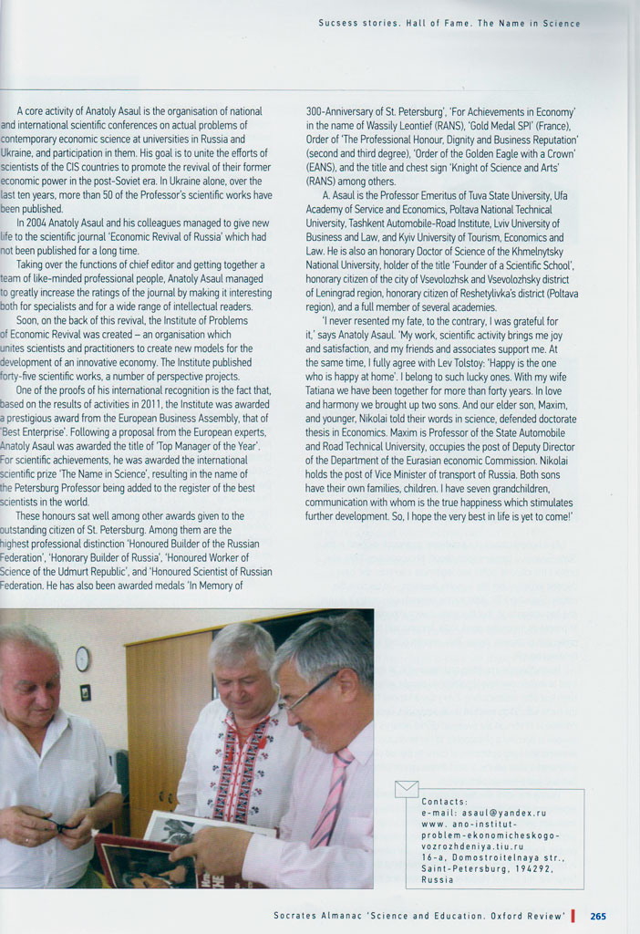 "Socrates Almanac" издаваемый Европейской Бизнесс Ассамблеей (Europe Business Assembly) имеет множество тематических разделов. В издании 2013 года раздел "World scientists. Success stories" ("Ученые мира. Истории успеха") открывает статья об Анатолии Николаевиче Асауле.