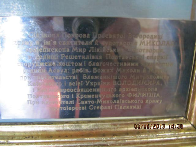 Под руководством настоятеля Свято-Николаевского храма в Решетиловке (Полтавская обл.) протоиерея Стефана Паляницы, при финансовой поддержке почетного гражданина Решетиловского района профессора Анатолия Николаевича Асаула завершена роспись храма.
