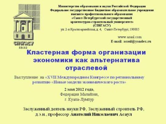 В рамках конгресса Анатолием Николаевичем был представлен доклад на тему: "Кластерная форма организации экономики как альтернатива отраслевой":