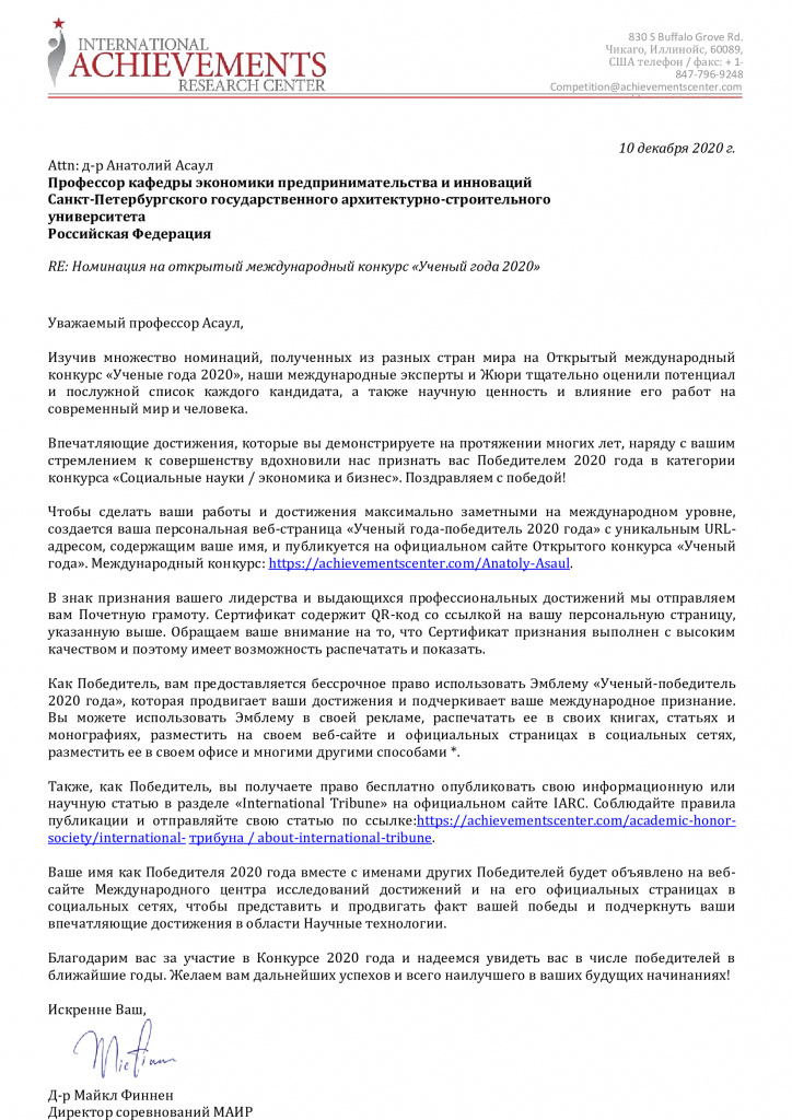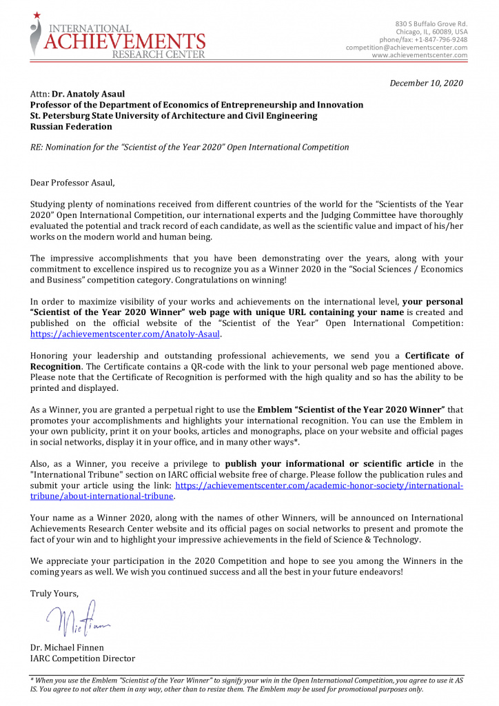 В США штат Чикаго, Иллинойсе прошел открытый международный конкурс «Ученые года 2020». Ibternational achievements research center признал профессора Асаула Анатолия Николаевича Победителем 2020 года в категории конкурса «Социальные науки / экономика и бизнес».