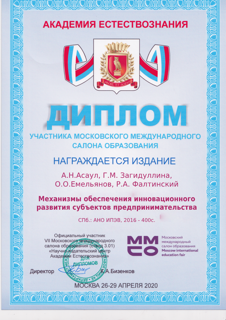Учебник «Экономика недвижимости», изданный в 2018 году в издательстве «Юрайт» (авторы Асаул А. Н., Загидуллина Г. М., Люлин П. Б., Сиразетдинов Р. М.), размещен в научной электронной библиотеке elibrary.ru – крупнейшем информационно-аналитическом портале в области науки, технологии и образования. О его востребованности свидетельствует нормируемая цитируемость по направлению 2.385, а также переиздание учебника в 2019 и в 2020 году. Цитируемость учебника, несмотря на недавний выход в свет, превышает – 20 (по elibrary.ru).