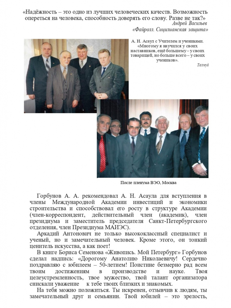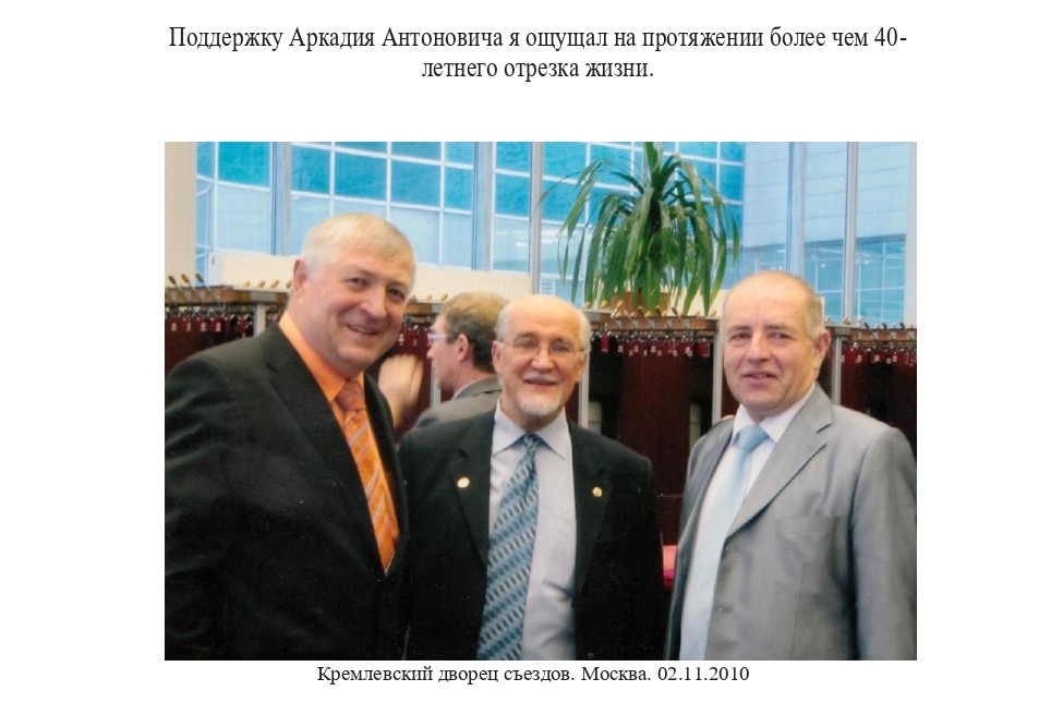 По моему убеждению, Аркадий Антонович олицетворял собой настоящего советского человека. Его всегда выделяло чувство ответственности и самостоятельности, самоутверждения и самосовершенствования его собственной личности. Ему присуще чувство товарищества. На него всегда можно было положиться. Я всегда считал и считаю его высокоморальным и высокодуховным человеком разделявшего идеалы коллективизма и самосознания, а семейные ценности для него всегда были на первом месте. Он был опорой для своих родителей, верным супругом, любящим отцом.