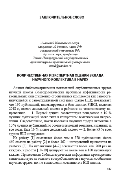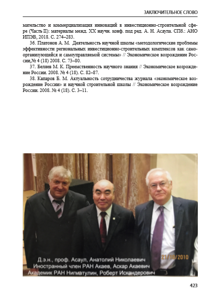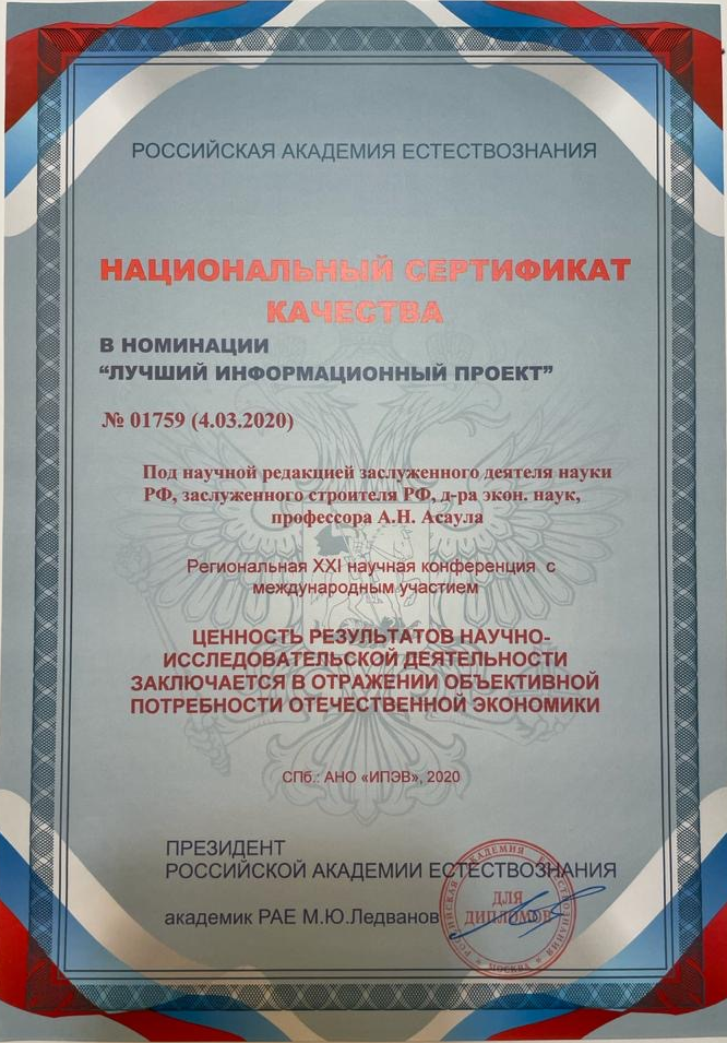 Золотой фонд отечественной науки вручил лидеру научной школы "Методологические проблемы эффективности региональных ИСК как самоорганизующейся и самоуправляемой системы" профессору А.Н.Асаулу диплом лауреата международной выставки на лучшее учебно-методическое издание в отрасли. Материалы региональной XXI научной конференции с международным участием "Ценность результатов научно-исследовательской деятельности заключается в отражении объективной потребности отечественной экономики", книга удостоена Национального сертификата качества в номинации "Лучший информационный проект".