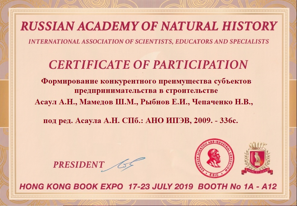- Асаул А.Н., Мамедов Ш.М., Рыбнов Е.И., Чепаченко Н.В., под ред. Асаула А.Н. Формирование конкурентного преимущества субъектов предпринимательства в строительстве