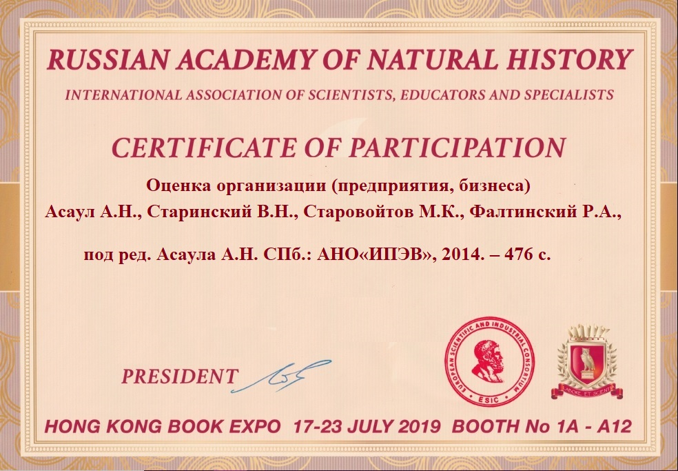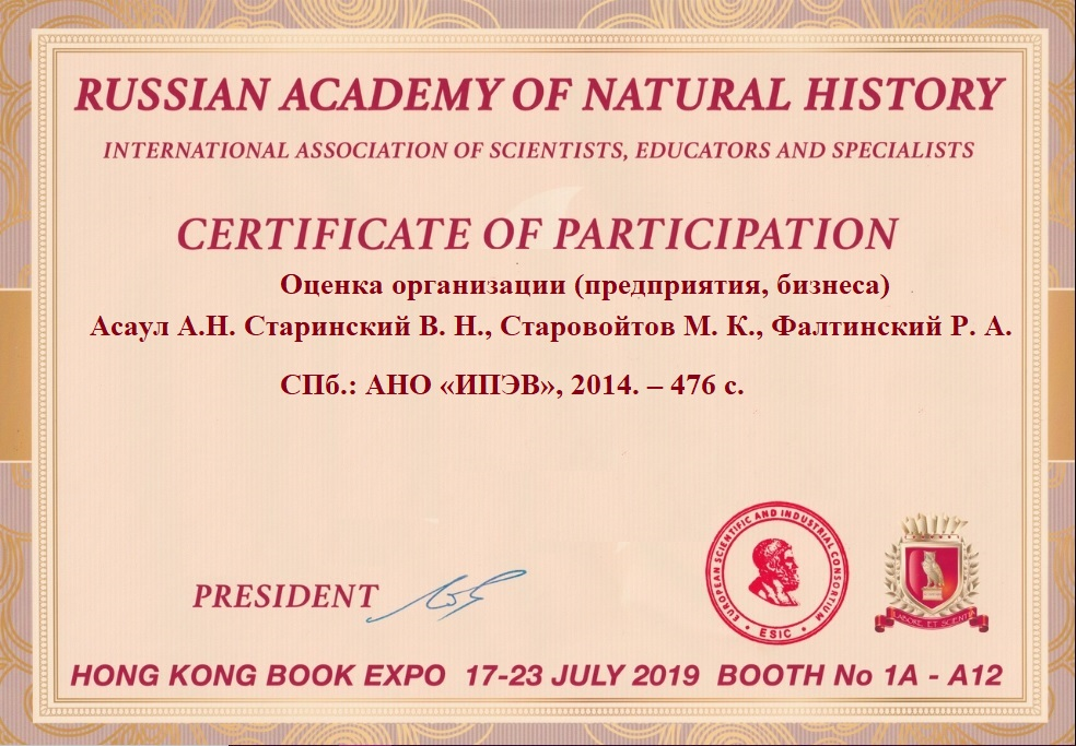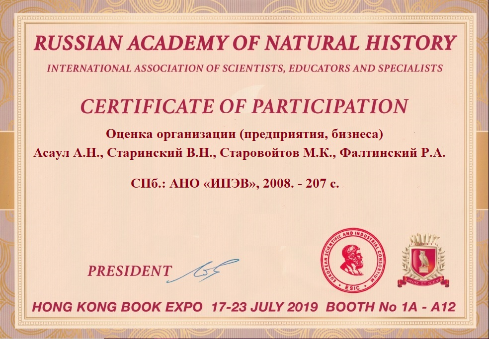 - Асаул А.Н. Старинский В. Н., Старовойтов М. К., Фалтинский Р. А. Оценка организации (предприятия, бизнеса)