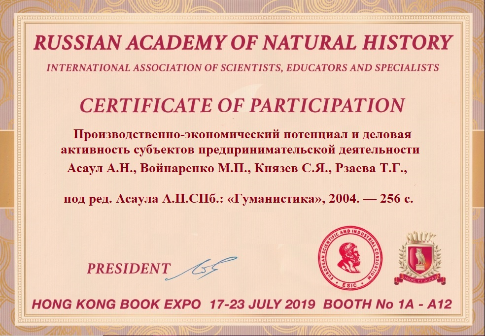 - Асаул А.Н., Войнаренко М.П., Князев С.Я., Рзаева Т.Г., под ред. Асаула А.Н. Производственно-экономический потенциал и деловая активность субъектов предпринимательской деятельности