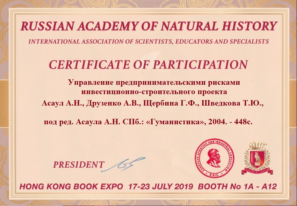 - Асаул А.Н., Друзенко А.В., Щербина Г.Ф., Шведкова Т.Ю., под ред. Асаула А.Н. Управление предпринимательскими рисками инвестиционно-строительного проекта