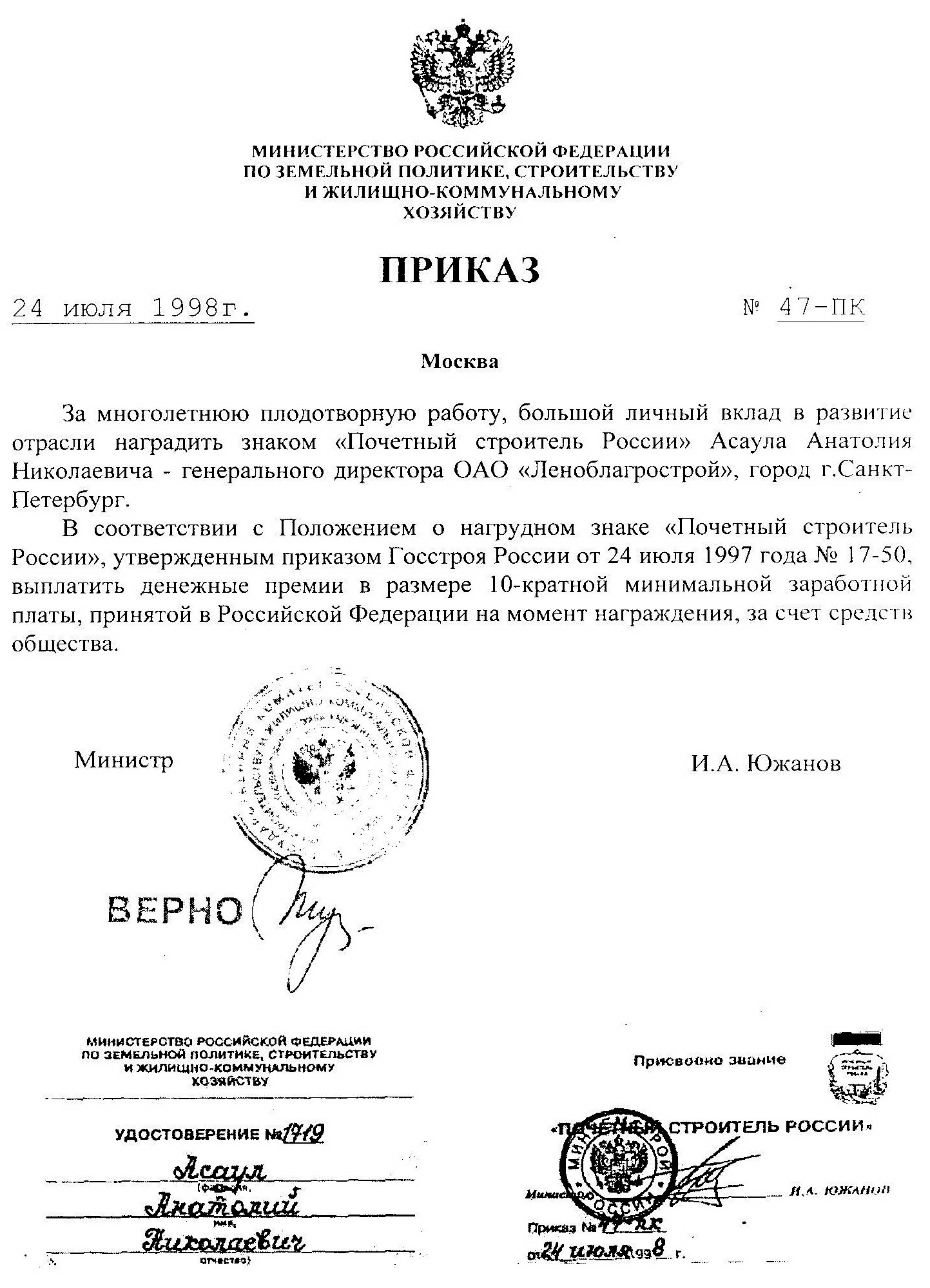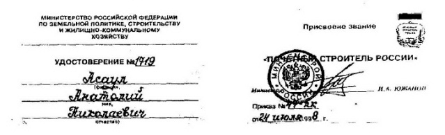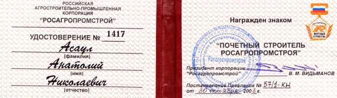 В 1995 г. награждён знаком «почётный строитель Нечерноземагропромстроя».