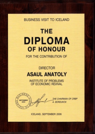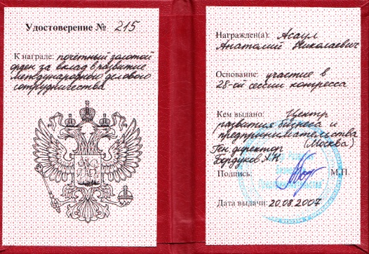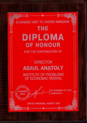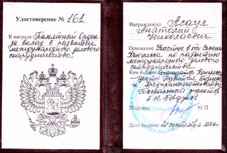 В 2007 г. Центром развития бизнеса и предпринимательства награждён памятным орденом за вклад в развитие международного делового сотрудничества.
