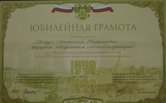 В 1999 г. награждён Юбилейной грамотой Госстроя РФ за достигнутые успехи в качественном обслуживании населения и в честь 350-летия жилищно-коммунального хозяйства РФ.