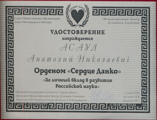 В 2006 г. за личный вклад в развитие науки награждён Советом общественных организаций Санкт-Петербурга и Москвы орденом «Сердце Данко».