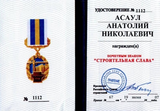 В 2007 г. Российским Союзом Строителей награждён почётным знаком «Строительная слава».
